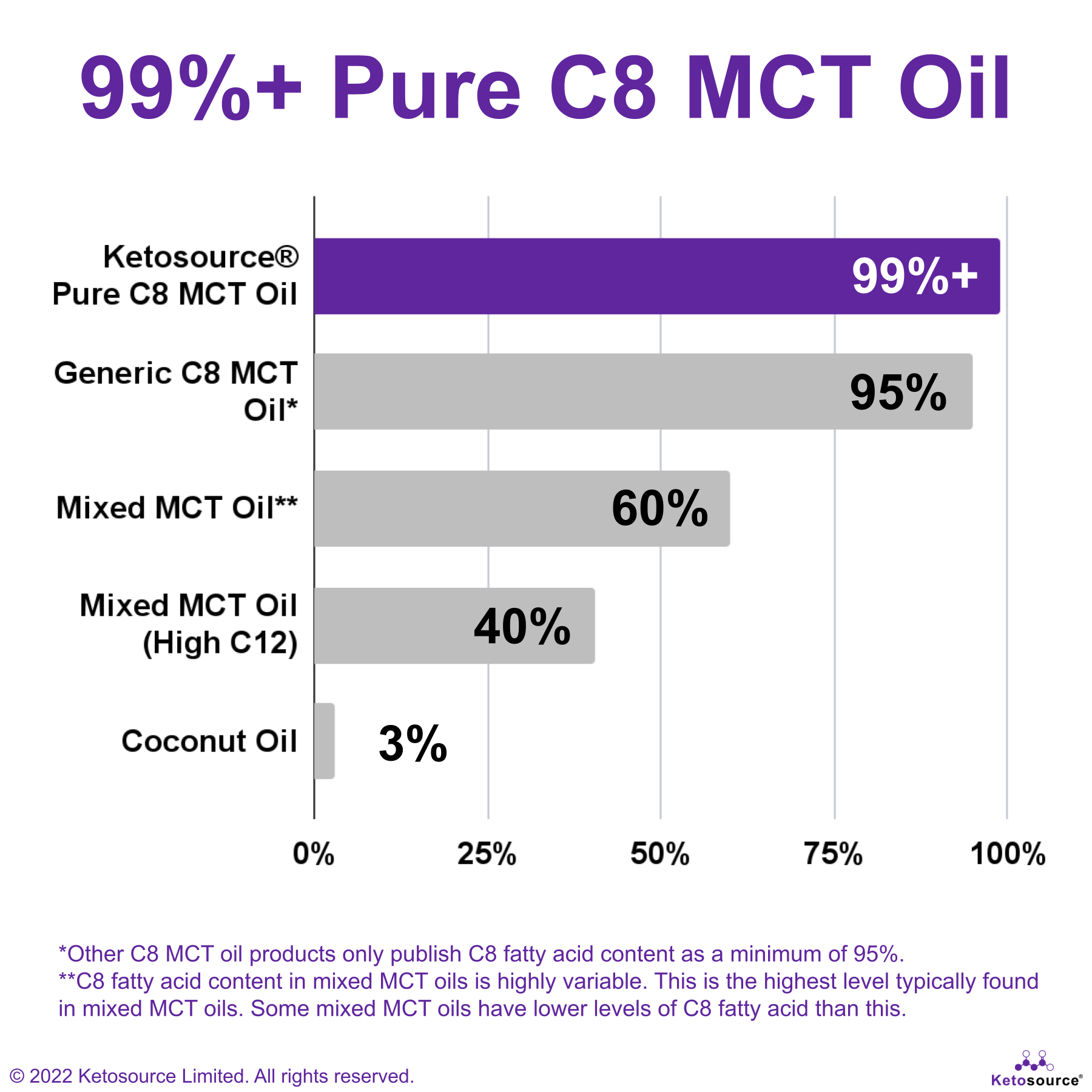 يعد زيت C8 MCT النقي هو الأكثر كفاءة من الدهون الثلاثية متوسطة السلسلة (MCT) في تحويلها إلى كيتونات عبر الكبد. ونتيجة لذلك، لكل جرام يتم استهلاكه، يتم إنتاج كيتونات أكثر من زيوت MCT الأخرى.